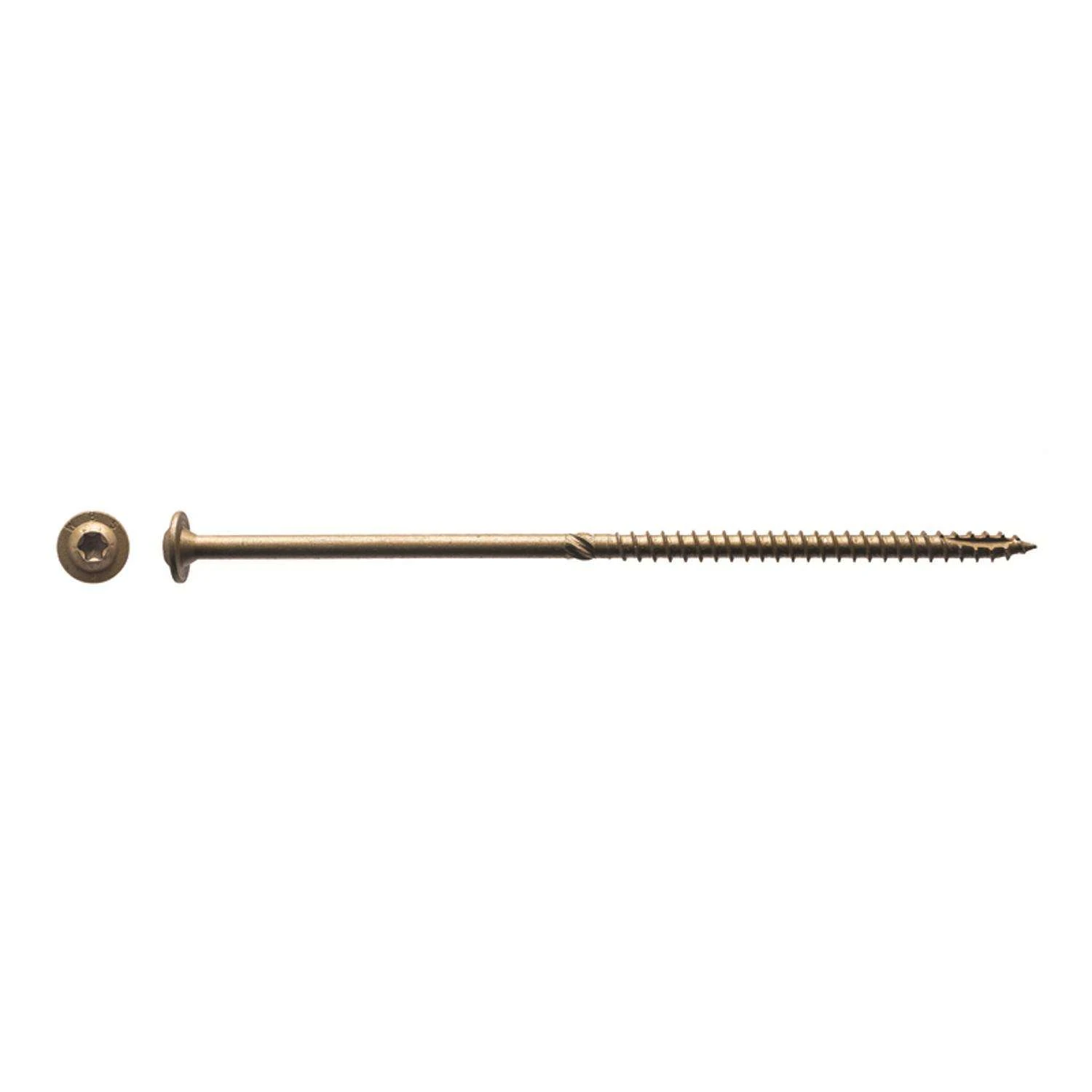 Heat-treated hardened steel for high tensile strength and high shear strength. Triple layer ACQ compatible bronze coating for exterior or interior use. Deep six-lobe star drive recess reduces cam-out end load. Handles twice the torque as Phillips or Square Drive while extending the life of the bit. Aggressive knurl enlarges the hole to reduce splitting and drag to help draw lumber together. Type 17 tip for faster precise starts which eliminates “walking” and provides easier insertion without pre-drilling. International building code and international residential code compliant. Built-in washer head for increased pull through strength Under-head cutting nibs to aid in self countersinking V-cut notches on threads to cut fibers for easier insertion at lower torque Aggressive thread for great withdrawal strength
